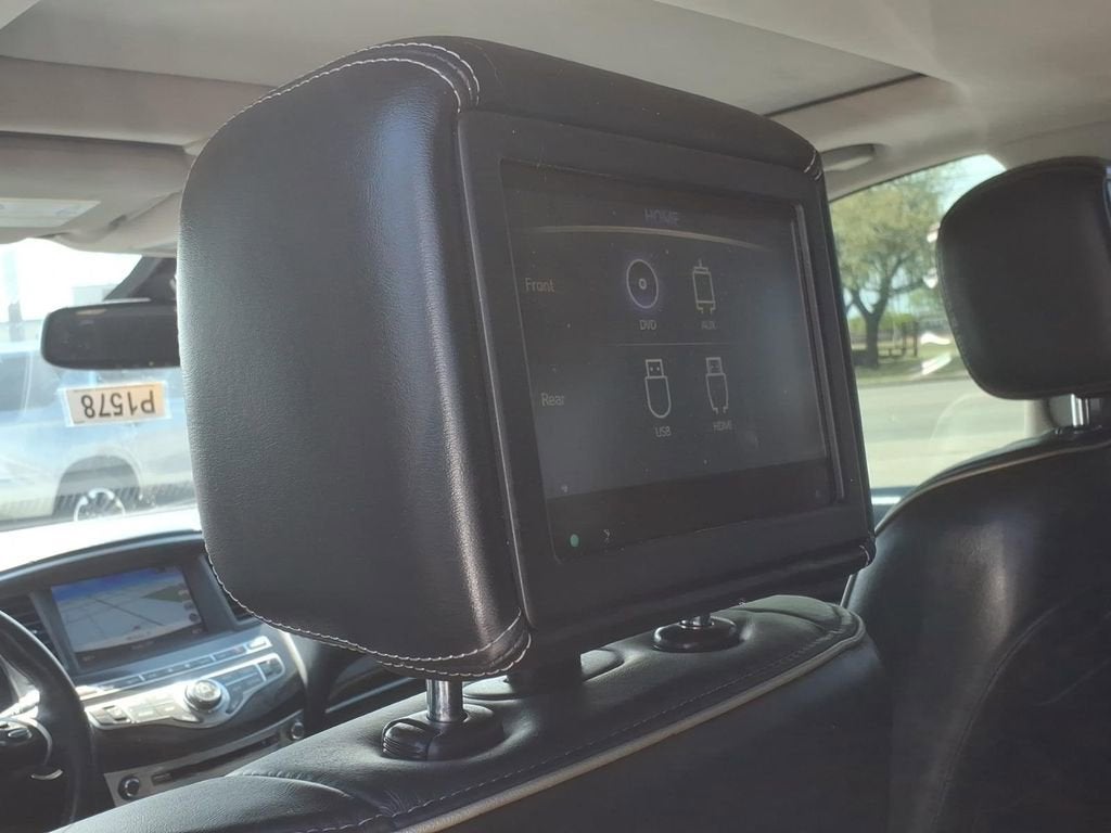 120V Power Outlet, 13 Speakers, 3rd row seats: bench, 4-Wheel Disc Brakes, 5.25 Axle Ratio, ABS brakes, Air Conditioning, Alloy wheels, AM/FM radio: SiriusXM, Anti-whiplash front head restraints, Around View Monitor w/Moving Object Detection, Auto-dimming Rear-View mirror, Automatic temperature control, Bodyside moldings, Brake assist, Bumpers: body-color, Cargo Package Essential, Cargo Protector, Carpeted Floor Mats (4-Piece Set), CD player, Console Net, Delay-off headlights, Driver door bin, Driver vanity mirror, Dual front impact airbags, Dual front side impact airbags, Electronic Stability Control, Essential Package, First Aid Kit, Four wheel independent suspension, Front & Rear Sonar System (2FR/2RR), Front anti-roll bar, Front Bucket Seats, Front Center Armrest w/Storage, Front dual zone A/C, Front fog lights, Front reading lights, Fully automatic headlights, Garage door transmitter: HomeLink, Heated door mirrors, Heated Front Seats, Heated front seats, Heated steering wheel, Illuminated entry, Illuminated Kick Plates (IKP), Illuminated Kick Plates (K11), INFINITI InTouch w/Navigation & InTouch Services, Leather steering wheel, Leather-Appointed Seat Trim, Leatherette Seat Trim, Literature Kit, Low tire pressure warning, Memory seat, Occupant sensing airbag, Outside temperature display, Overhead airbag, Overhead console, Panic alarm, Passenger door bin, Passenger vanity mirror, Power door mirrors, Power driver seat, Power Liftgate, Power moonroof, Power passenger seat, Power steering, Power windows, Radio data system, Radio: AM/FM/CD/DVD w/Bose Premium Audio System, Rain-Sensing Front Windshield Wipers, Rear air conditioning, Rear anti-roll bar, Rear Bumper Protector, Rear Cargo Cover, Rear reading lights, Rear seat center armrest, Rear window defroster, Rear window wiper, Reclining 3rd row seat, Remote keyless entry, Roof rack: rails only, Security system, Speed control, Speed-sensing steering, Speed-Sensitive Wipers, Splash Guards (Color Matched, Set of 4), Split folding rear seat, Spoiler, Steering wheel memory, Steering wheel mounted audio controls, Tachometer, Telescoping steering wheel, Theater Package, Tilt steering wheel, Traction control, Trip computer, Turn signal indicator mirrors, Variably intermittent wipers, Voice Recognition for Navigation Functions, Wheels: 18 Triple 5-Spoke Aluminum-Alloy, Wireless Headphones (2).